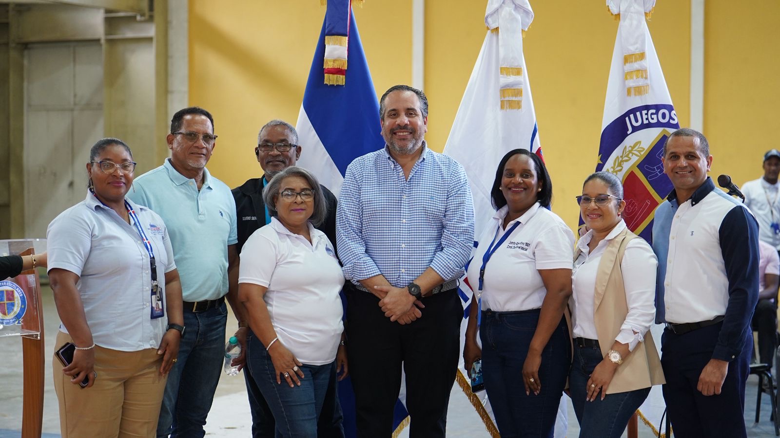 El director ejecutivo del Instituto Nacional de Educación Física (INEFI), Alberto Rodríguez Mella, junto a varios profesores y técnicos del municipio Los Alcarrizos donde dio inicio a los Juegos Interescolares, organizados por el Distrito Educativo 15-01.
