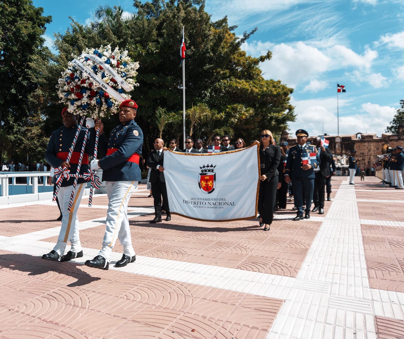 Además de Mateo y Alcántara, la comitiva municipal que hizo la ofrenda floral también estuvo representada por el intendente del Cuerpo de Bomberos, general José Luis Frómeta; por el presidente del Concejo de Regidores, Yovany Moya; y por el director de Gestión Humana, Luis Veras.